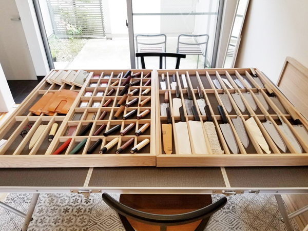 そんなこんなで完成しまして、なんとか納期限内に発送…それから数日後、実際に包丁を入れた様子を送ってくれました。写真を見て「お~」となりましたが、これだけ収まると壮観です。